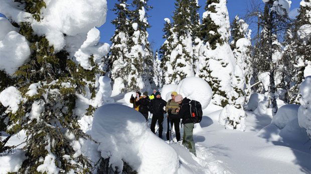 Tule kokemaan keväisen auringon lämpimät säteet, hankien pehmeät muodot sekä jylhät tykkylumiset kuuset. Syöte on Suomen lumisinta seutua, joten lumikenkäily Ahmavaaran maisemiin on elämyksellistä ja ennenkaikkea hauskaa! Retken aikana on mahdollista harjoitella talvisessa maastossa yöpymistä, tutustua kunnolla lumikenkäillyyn sekä nauttia erämaasaunan lempeistä löylyistä.